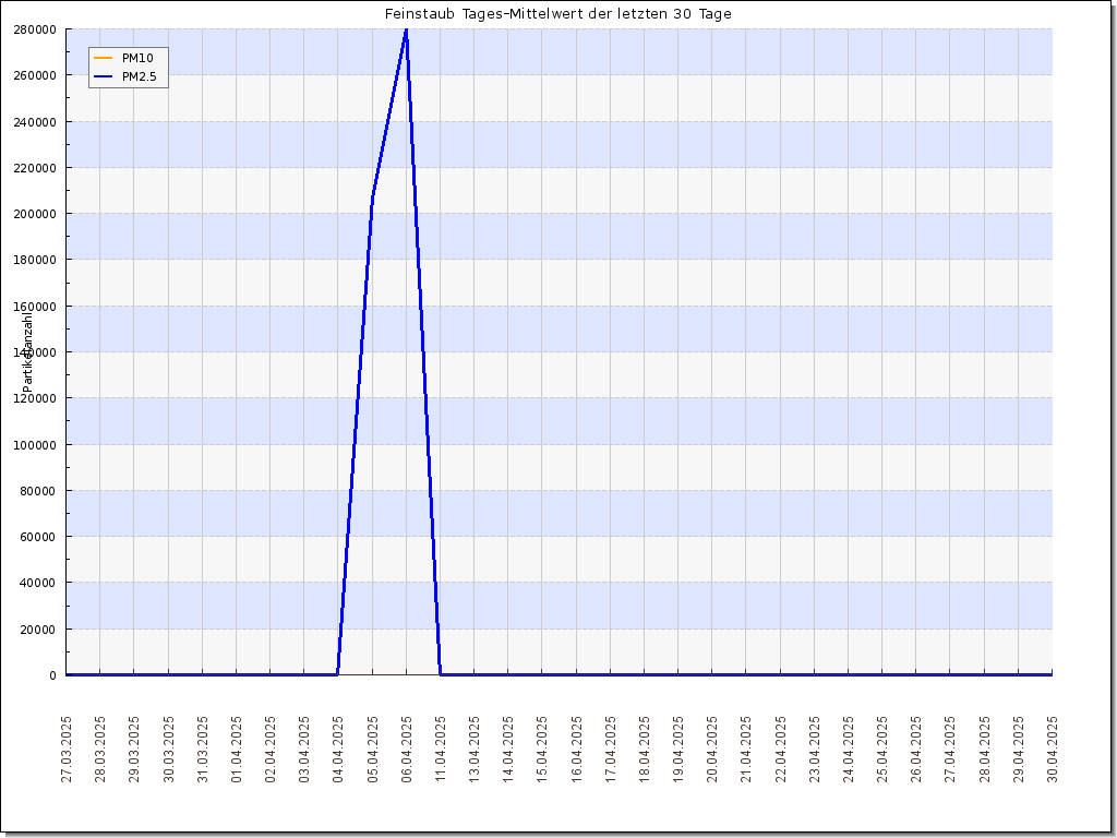 Am Standort DB0WV ist seit August 2018 ein Feinstaubsensor in Betrieb. Details zum Messaufbau/Sensor sind unter der Rubrik "Technik->Feinstaub" zu finden.